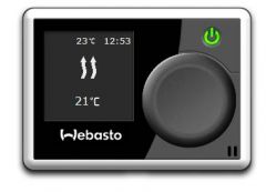 Панель MultiControl Car состоит из :ЖК-дисплей, индикатор состояния, кнопка непосредственного включения подогревателя, датчик температуры, логотип Webasto, кнопка-колесо для навигации в меню, соединительный кабель и диагностический разъем.